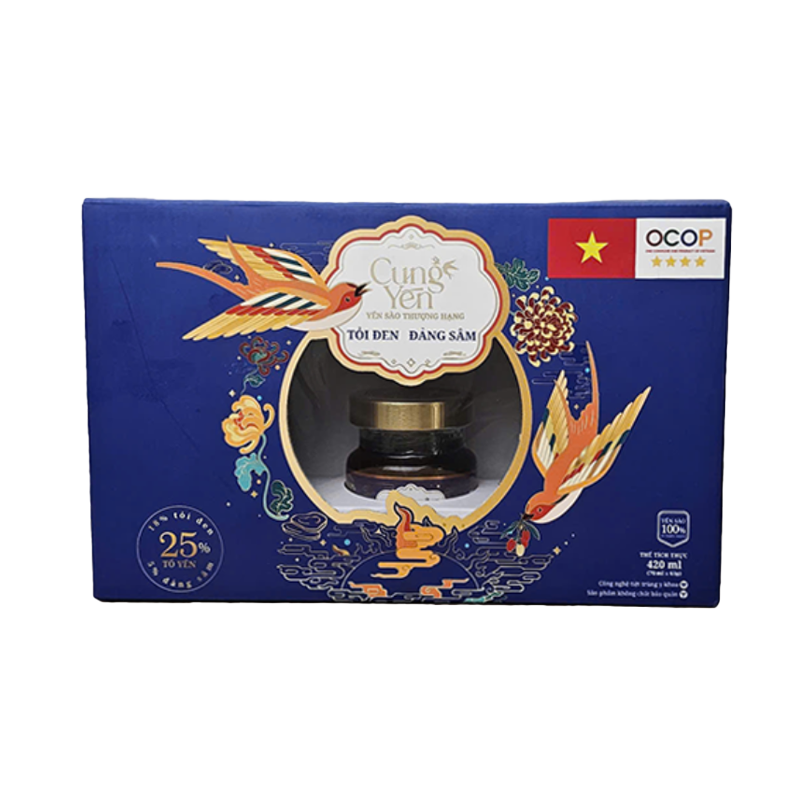 Thành phần: Nước tinh khiết 40%, tổ yến 25%, tỏi đen 18%, đường 9%, đảng sâm 5%, Gừng 3%,…