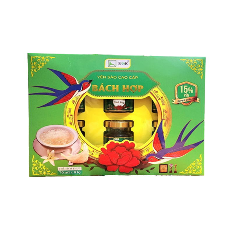 Thành phần: Nước tinh khiết 50%, Bách Hợp 16%, Tổ Yến 15%, Đường Phèn 9%, Đảng Sâm 5%, Cam Thảo 3%, Gừng 2%,…